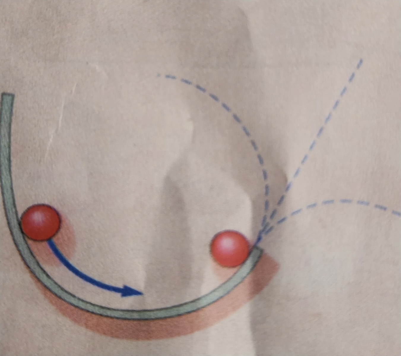 그림 5-4는 수평인 테이블 윗면을 내려다본 그림이다. 테이블 윗면에는 공에 힘을 작용하는 굽은 장벽이 있어서 그림에서와 같이 원형 경로에서 운동하도록 한다. 공과 장벽과의 접촉이 끝난 후에는 어느 점선 경로에서 운동할까?