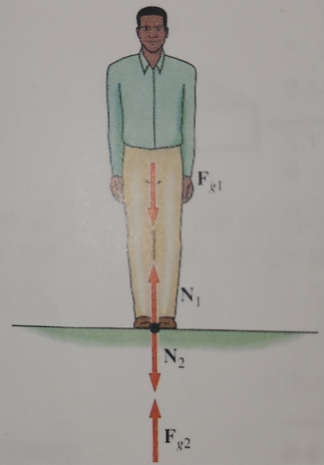 지구가 당신에게 아래쪽으로의 힘을 작용하게 하면 Newton의 제3 법칙에 의하여당신이 지구에 위쪽으로의 힘을 작용한다. 지면에 서 있으면 그림 5-23에서와