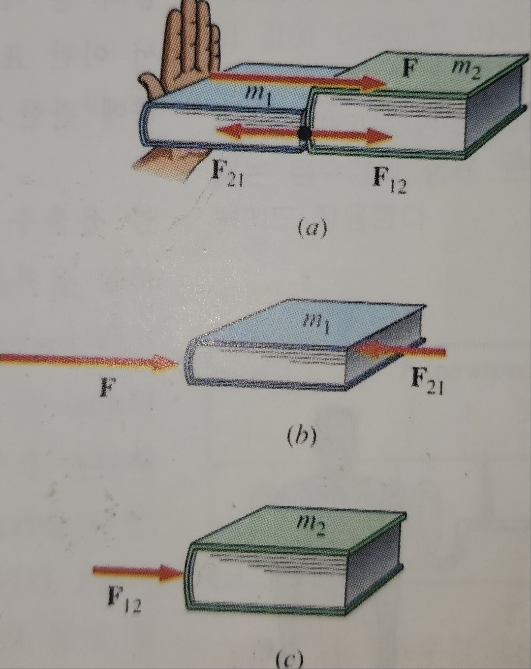 (b) 두 힘이 작용하고 있는 책 1.(c) 단일 힘이 작용하고 있는 책 2