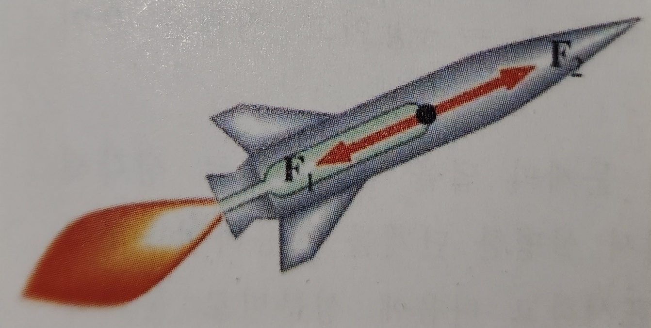 가 같은 힘 F₂를 주고 따라서 로켓은전방으로 가속된다.